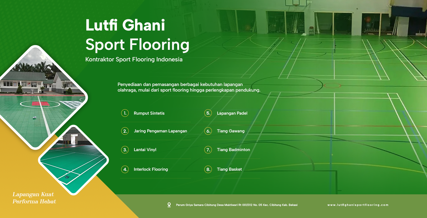 Lutfi Ghani Sport Flooring adalah perusahaan yang bergerak di bidang penyediaan dan pemasangan berbagai kebutuhan lapangan olahraga, mulai dari sport flooring hingga perlengkapan pendukung. Kami hadir untuk memberikan solusi terbaik bagi pembuatan maupun renovasi lapangan dengan hasil yang rapi, kuat, dan sesuai standar.